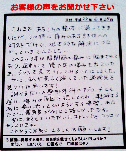 「丁寧に話を聞き、状態を診て、分かりやすく伝え、セルフケアを指導する」を徹底し、多くの感謝の声をいただいています。