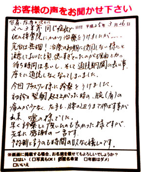 しかし、当院で初回の施術を受けた翌朝には、肩の痛みが軽減し、動かせる範囲も広がったと喜ばれていました。